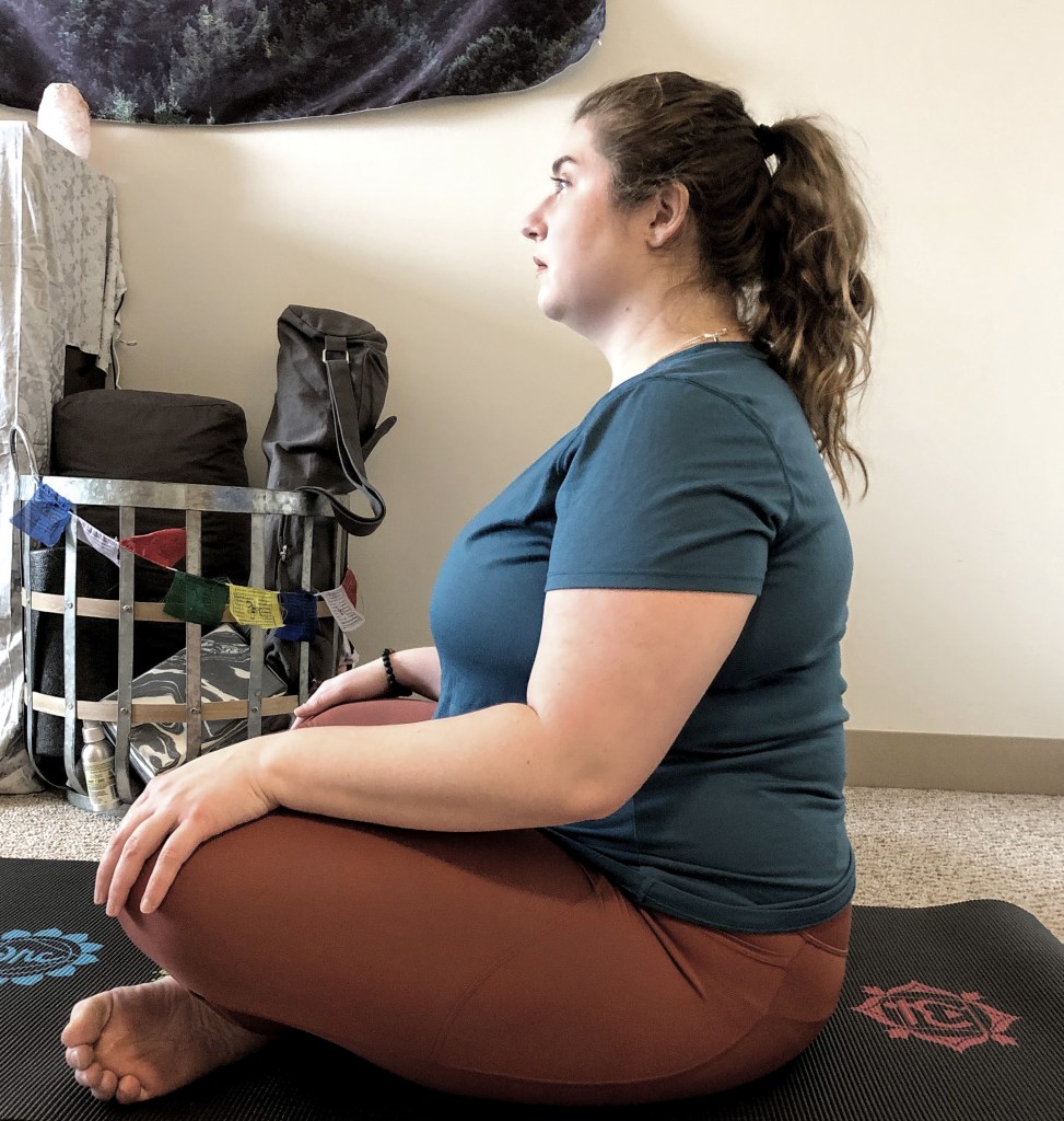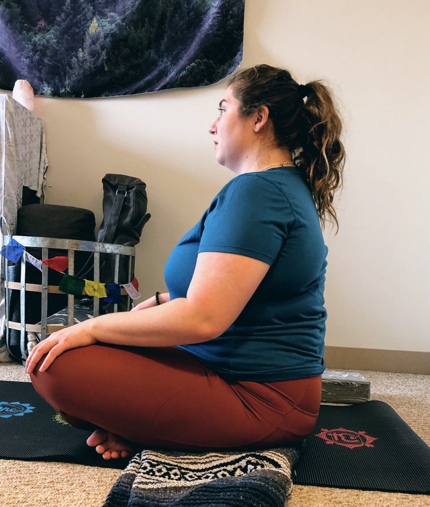 For example, you can sit up with a block, a bolster (or pillow at home), or a blanket to raise yourself up so it’s a little bit less pressure on your lower back. There is also a really nice chair modification where you align your hips, with one foot flat on the floor and crossing the opposite ankle over your knee and taking a minute or so in that pose. I know in my picture my hips don’t look aligned, but I took this picture about several times even when paying more attention to it, and it didn’t look great. But that’s okay, because it’s more important that I know the pose was done correctly and that it was right for my body.