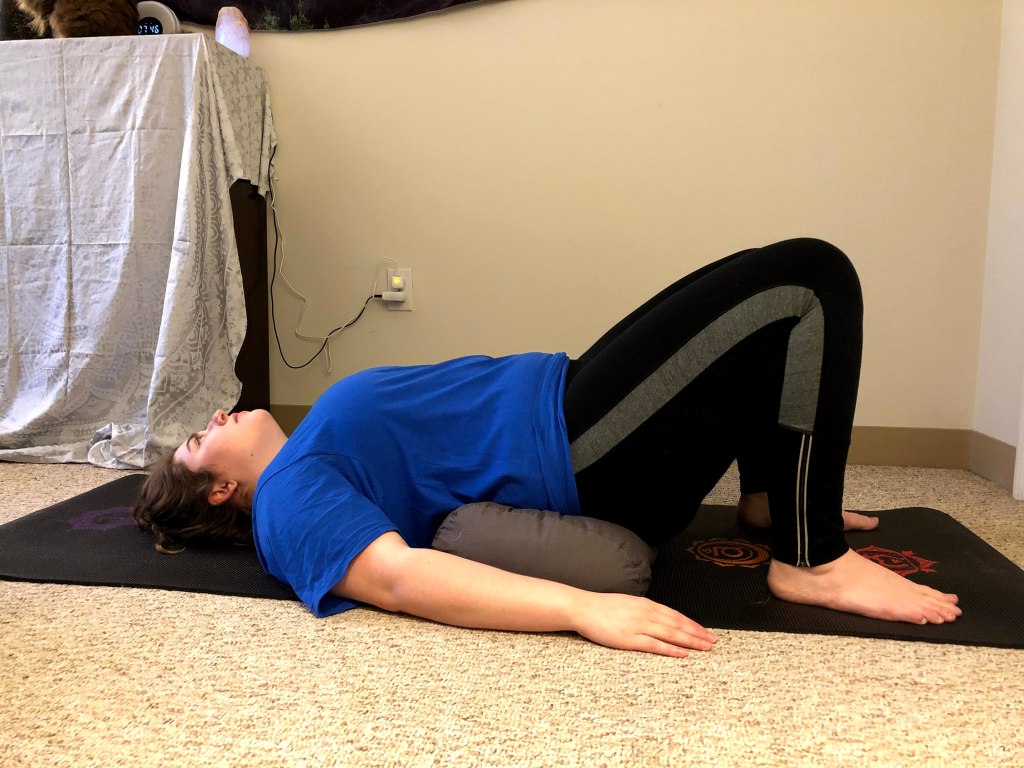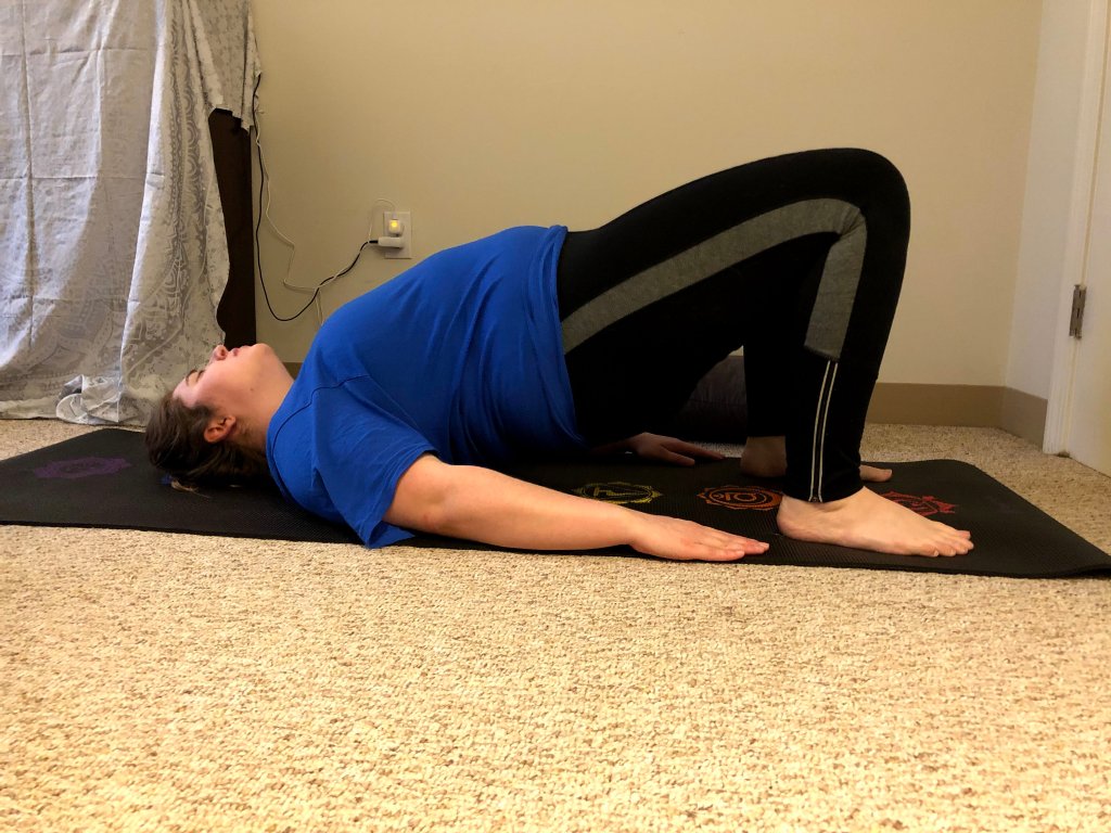 Also known as Setu Bandha Sarvasana, this is also a favorite pose of mine. Sadly with this one, there is no modification for the chair (that I’m aware of). But it’s a favorite of mine because you can really feel this pose no matter the level of intensity you stay in it. The most important thing in this pose is to roll your shoulders back, and to get your ankles to where your finger tips are touching them before you raise up with your legs. It does a great job stretching the back body, while energizing your legs and glutes. A nice modification when practicing Bridge Pose, is to use a bolster or a block under your sacrum, so your still getting the stretch, but giving your back the support it needs. I personally like using a bolster when practicing restorative, where you typically are in a pose for about five minutes at a time. I can’t wait to share the rest of the week with you where we focus on Warrior Poses.